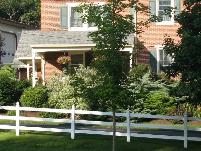 ● Cerca paisajística de una propiedad residencial: postes de PVC blancos combinados con rieles horizontales y vegetación crean un límite clásico de estilo inglés o americano.