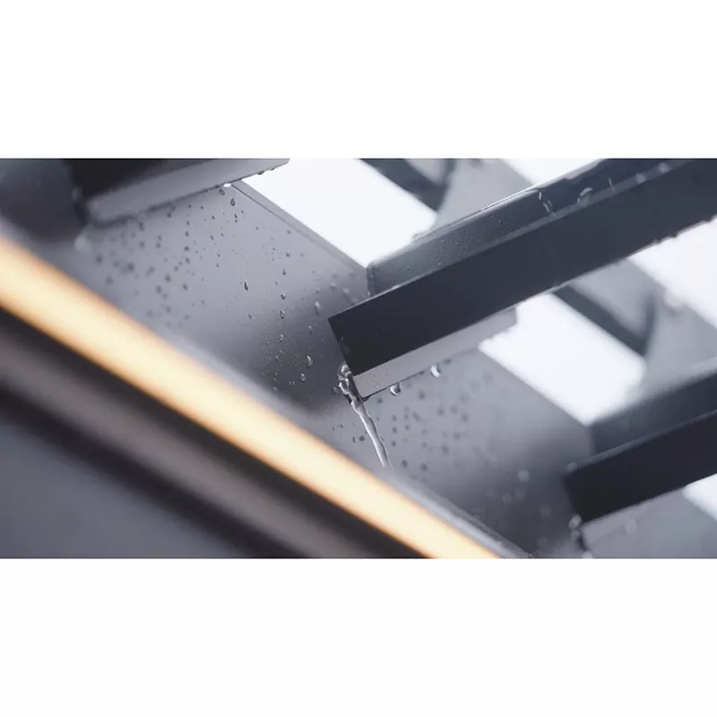 Cuando están cerradas, las rejillas forman una estructura completa a prueba de lluvia. El agua de lluvia fluye a través de los bordes de las lamas hacia las vigas transversales, luego hacia los canales de drenaje integrados en las columnas y finalmente drena al suelo, evitando la acumulación en la superficie.