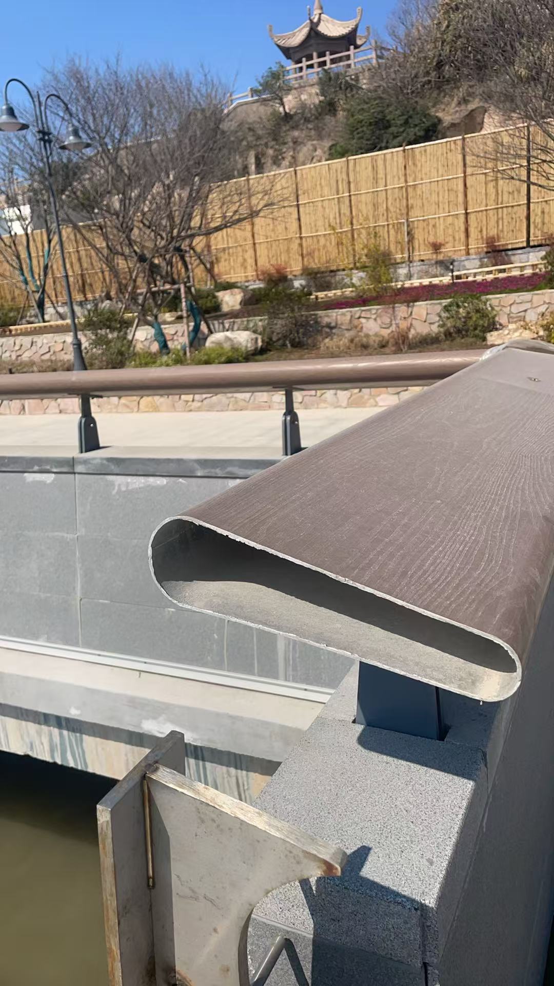 El proyecto emplea material de aleación de aluminio y logra un efecto visual cercano a la madera natural a través de la tecnología de transferencia de vetas de madera. En comparación con los pasamanos tradicionales de madera maciza, la aleación de aluminio ofrece una resistencia superior a la corrosión y una vida útil más larga, lo que la hace especialmente adecuada para entornos costeros de alta salinidad.